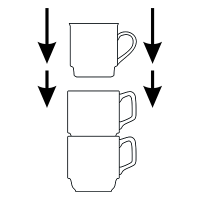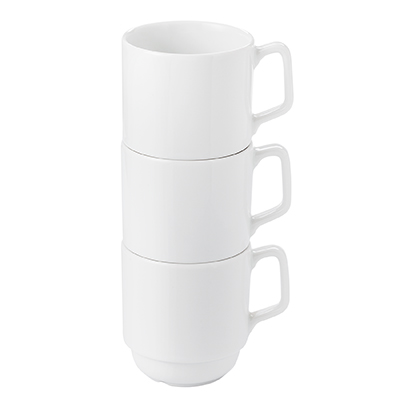Biały kubek o eleganckim, kawiarnianym charakterze. Fason umożliwiającym sztaplowanie.
