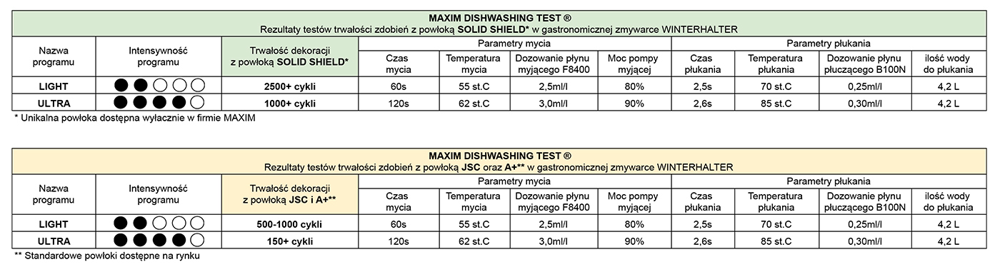 Wyniki testów trwałości nadruku, przeprowadzonych w profesjonalnych zmywarkach Winterhalter, nie mogą być bezpośrednio przenoszone na warunki domowe ze względu na znaczące różnice w typach urządzeń, cyklach mycia oraz stosowanych detergentach.
